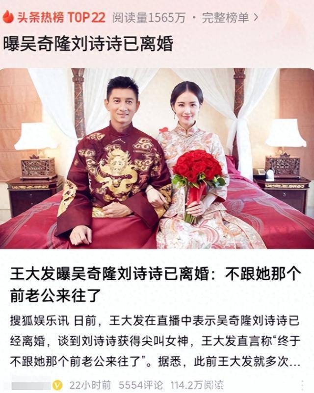 王大发在直播中爆料,刘诗诗和吴奇隆已经分道扬镳,多年都未曾见面。